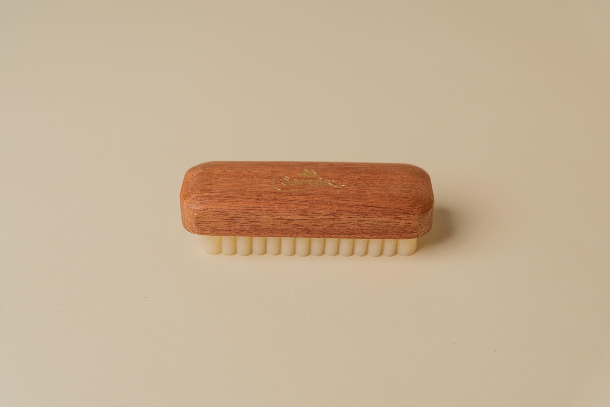 Lastly, Saphir's Suede Crepe brush helps brush out dirt, distribute sprays more evenly, and restore the nap (the hairs) of your suede. A must have for suede care.